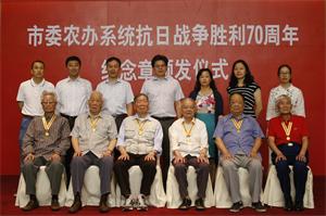 我院抗战老干部参加市农办纪念抗战胜利座谈会 来源: 作者: 发布时间:2015-09-15 00:00:00 浏览次数: 次 【字体:小 大】 9月15日上午,我院抗战老干部顾金德、魏殿三俩人参加了市委农办系统举办的纪念抗战胜利70周年座谈会。顾金德同志在座谈会上作了交流发言。 市委农办副主任冯志勇为部分抗战老干部佩戴纪念章并与抗战老干部合影留念。 分享到: 【打印正文】