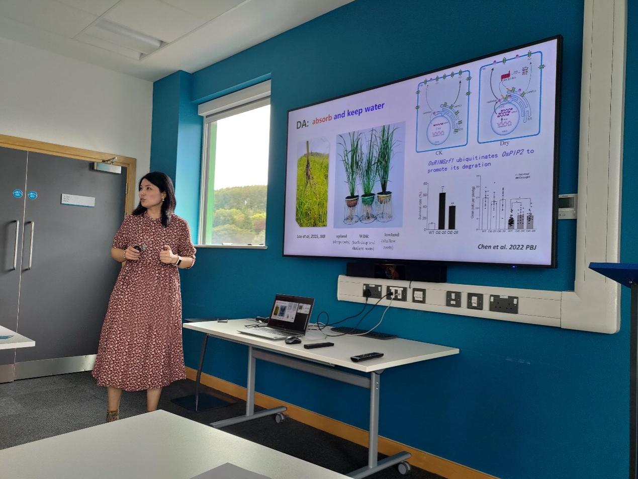 亚伯大学董事会主席Meri Huws教授会见中方团队,对中方到访表示热烈欢迎。楼巧君和南京农业大学刘守阳教授分别代表各自团队在交流会上做节水抗旱稻研发和表型技术支撑、高通量植物表型新技术等学术报告。亚伯大学生物环境和农村科学研究所(IBERS)所长Alison Kingston Smith教授、亚伯大学代谢组学研究中心负责人Luis Mur教授和另有6位学者报告了各自在表型组学、代谢组学、生物节律表型检测、快速育种等方面的研究情况。