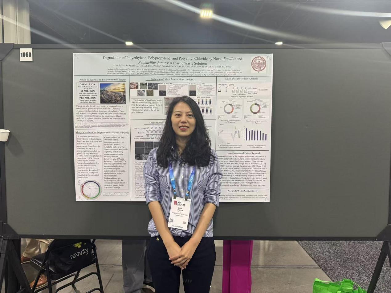 在周集中教授的全力支持和指导下,孙丽娜深化了对微塑料降解机制的理解,并系统学习了多项前沿实验技术,包括高通量测序技术、质谱分析方法以及基因编辑在微生物代谢研究中的应用。这些技术为研究微生物菌株在塑料降解中的作用机理提供了重要技术支持。在美进修期间,孙丽娜积极参与国际学术交流活动,并在2024年美国微生物学会(ASM)年会上作了题为“Degradation of Polyethylene, Polypropylene, and Polyvinyl Chloride by Novel Bacillus and Neobacillus Strains: A Plastic Waste Solution”的学术报告。该报告引起了与会专家的广泛关注,进一步推动了关于塑料污染治理技术的深入讨论。