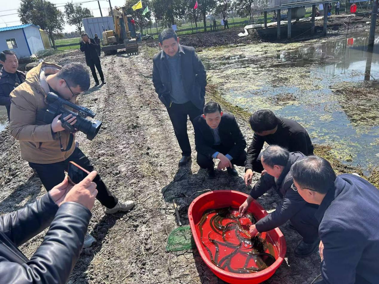 2025年3月19日,生态所周文宗研究员和杨航博士前往扬州茂发水产养殖有限公司进行光伏池塘黄鳝网箱养殖技术指导,江都区畜牧水产技术服务中心丁文岭陪同指导。
