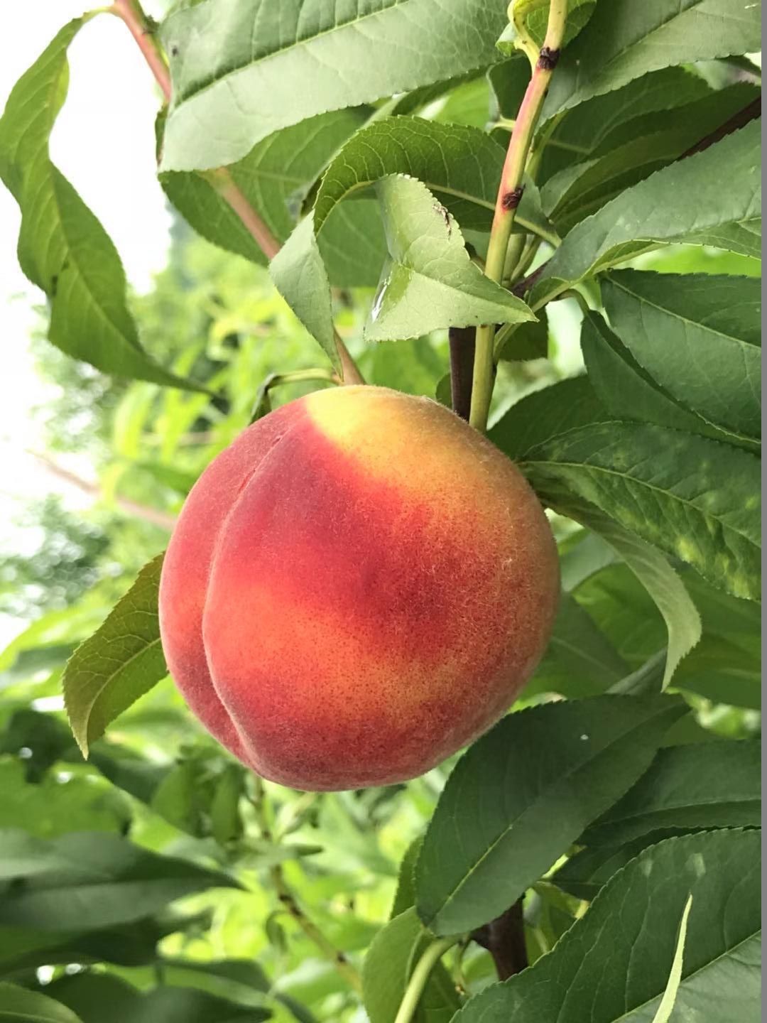 品种特性:通过有性杂交培育的优良鲜食黄桃品种。成熟期为8月上旬,果实近圆,较对称,果顶圆平,果形大,平均单果重220克。果皮金黄,不套袋情况下盖红色程度约为25%~50%。果肉黄色,汁液多,肉质致密,粘核,风味甜香,鲜食品质优。生长势强壮,树姿开张。铃型花,有花粉,自花结实率高。采用开心形整枝,每亩种植33株,5年生以上亩产1500公斤左右。