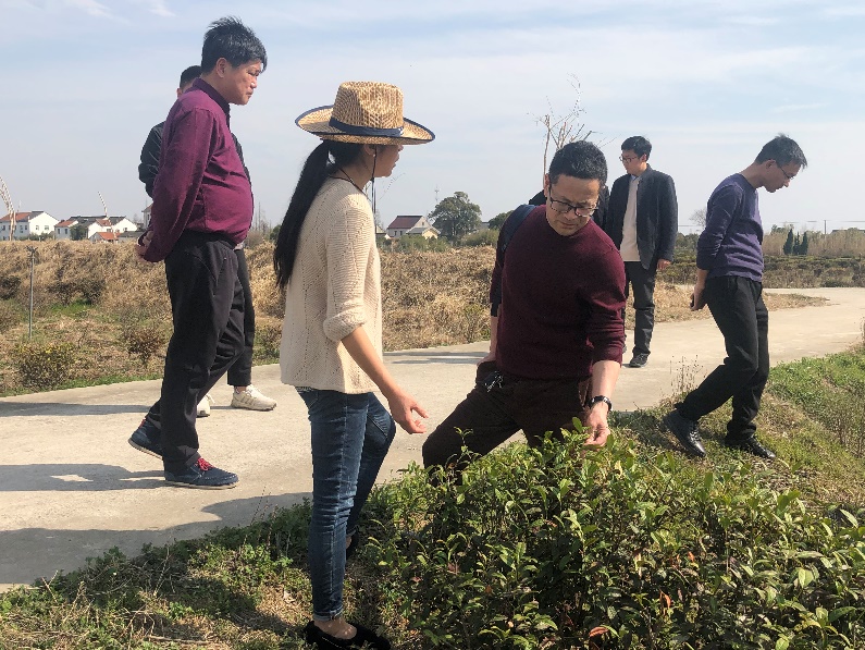 2月22日我院作物所农产品保鲜加工中心主任乔勇进与柳洪入博士到位于金山区枫泾镇下坊村的沪枫茶园进行调研和技术指导,上海丽农农业科技有限公司总经理张杰及销售总监蔡颖丽陪同并一起实地查看茶树生长情况。