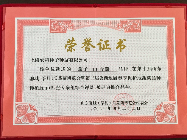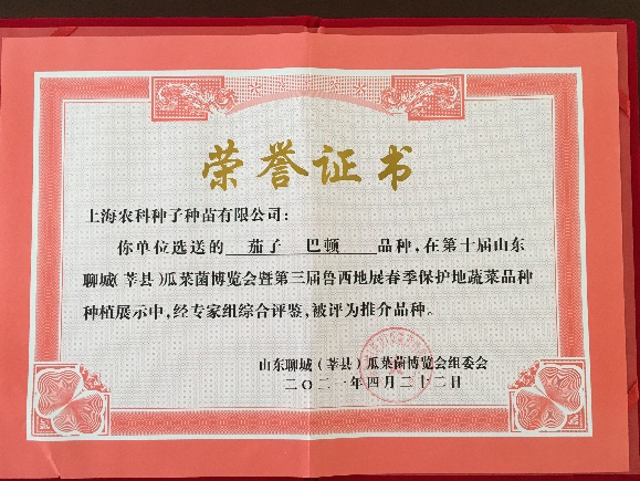 2021年第十届山东聊城(莘县)瓜菜菌博览会第三届鲁西地展园(莘县地展)征集参展单位212家,品种3106个;规模面积、品种数量在国内春季设施蔬菜地展中首屈一指。其中茄子课题组选送的新品种‘巴顿’、‘11青皮’获得专家推介品种。
