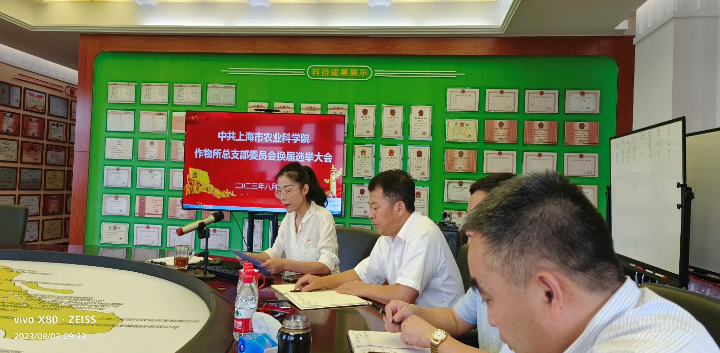 作物所副所长郑洪建宣读了《作物所党总支换届选举办法》,会议举手表决通过了任期工作报告、选举办法以及监票人、唱票人和计票人名单;作物所所长、副书记曹黎明宣读了《院党委关于作物所党总支部委员会候选人的批复》,全体党员以无记名方式进行投票,由监票人现场核查选票,唱票人、计票人进行公开唱票,最终裴红罗、曹黎明、郑洪建、詹向东、乔勇进、吴书俊、朱吉风7位同志当选为新一届党总支委员会委员。