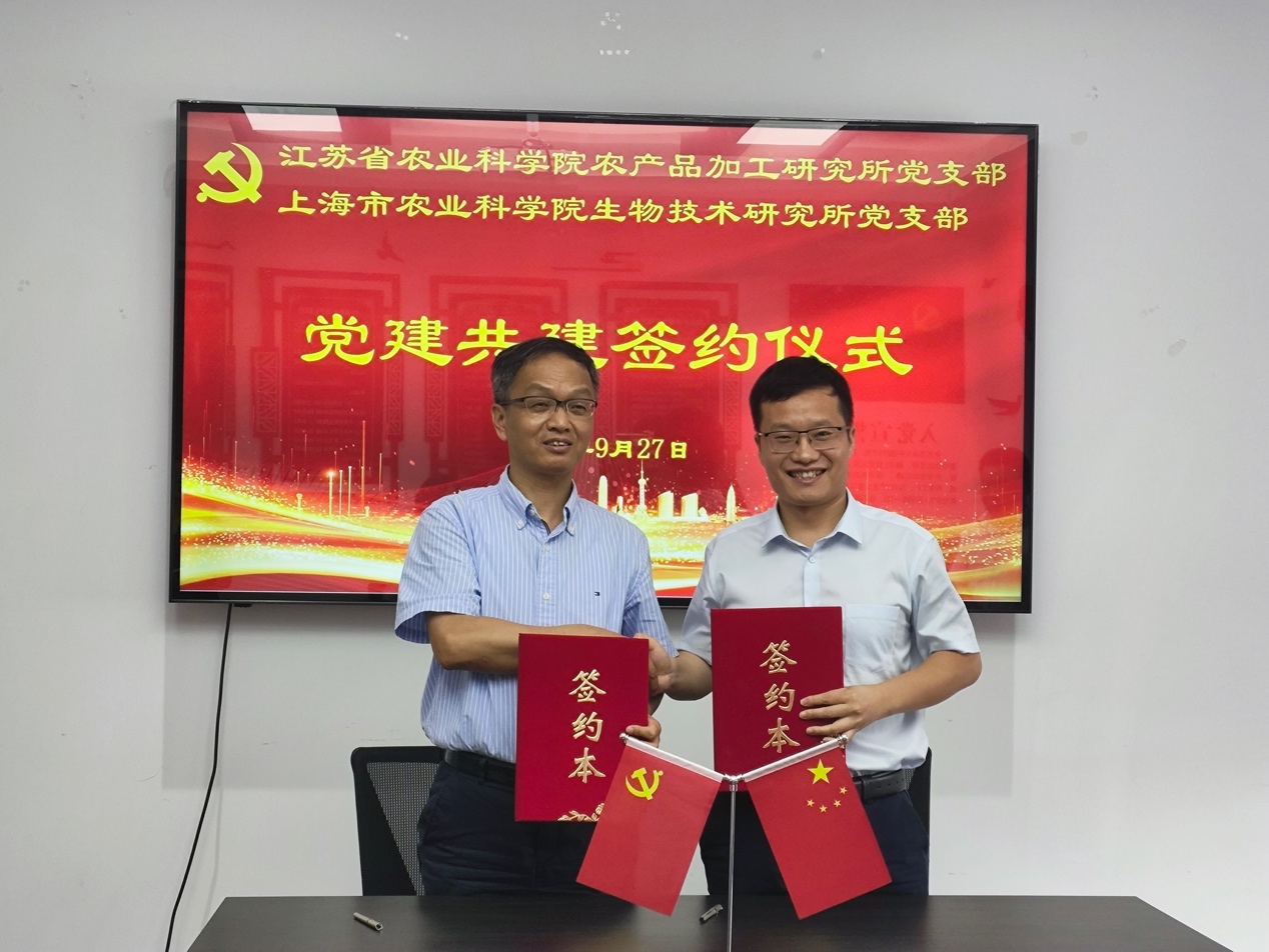 会上,施标对王道营一行的到来表示热烈地欢迎和衷心地感谢,并着重介绍了生物所近年来在党建方面、农业科技创新和农业科技服务方面的主要情况。王道营详细介绍了农产品加工研究所的基本情况、创新成果、合作交流和发展规划。双方专家团队就党建共建、科研项目申报、科技平台管理、成果转化、人才培养等方面进行了深入交流。随后,双方签订了《党建结对共建协议书》,并在健康功效评价和大麦藜麦后加工等科技合作方面达成共识。双方希望以此次党建共建活动为契机,充分发挥上海地域优势,以市场需求为导向,加强科技合作,更好地服务产业、企业和市民,推进长三角一体化发展。