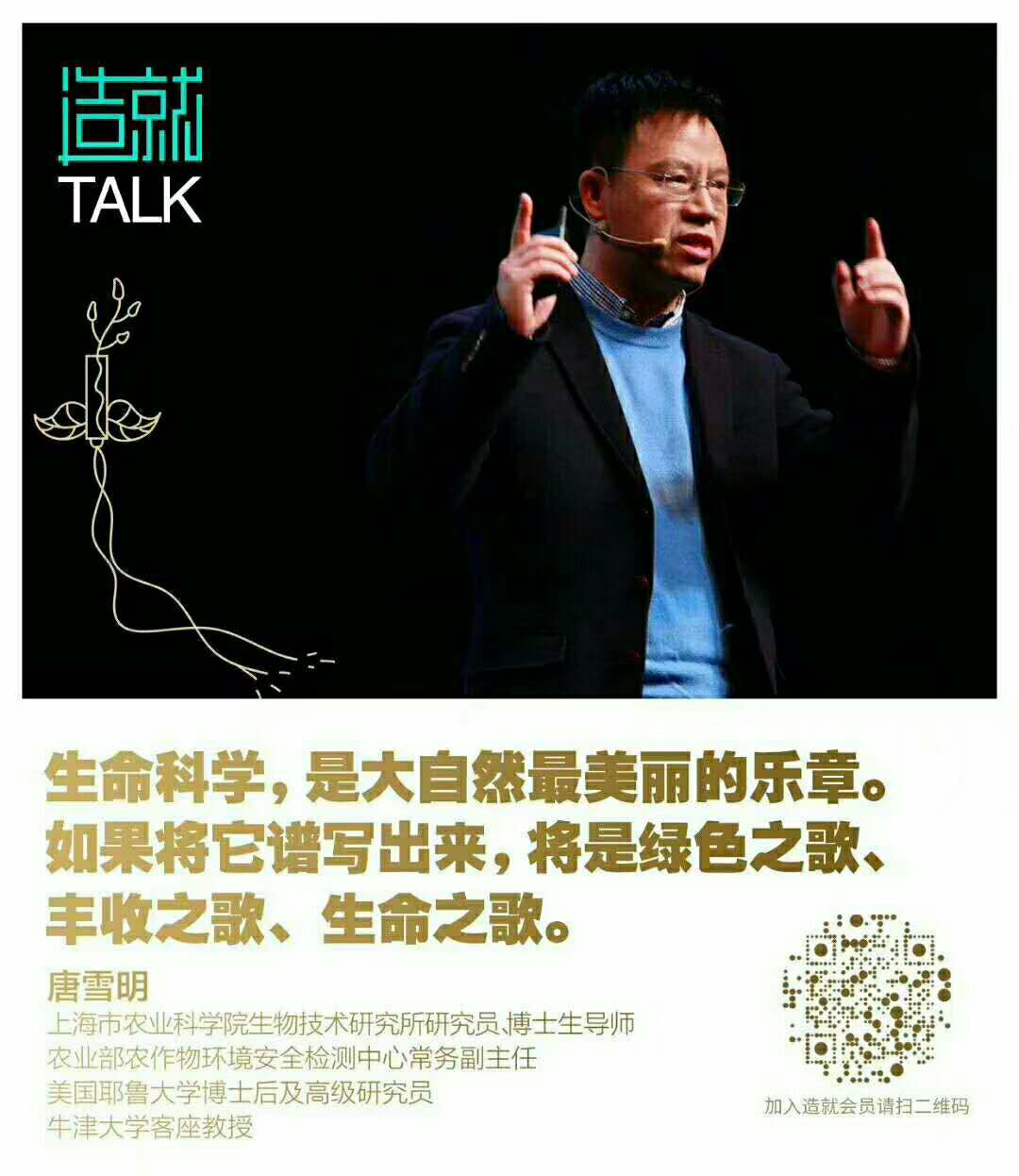 “造就talk”剧场演讲舞台被誉为中国的TED,据介绍已“邀请了超过200位全球领域的行业领袖”前来演讲。1月20日下午14:00,应“造就talk”团队邀请,上海市农业科学院生物技术研究所研究员、博士生导师唐雪明在梅赛德斯奔驰文化中心作了主题为“一粒种子改变一个世界”的精彩演讲,和大家一起分享了云生物技术、分子模块设计、表型组、微生物组、人工智能与智慧农业的现在和未来。