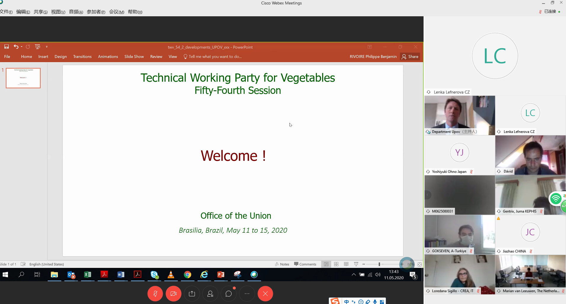 国际植物新品种保护联盟(UPOV)第54届蔬菜技术工作组(TWV)会议于5月11日至15日顺利召开。原定在巴西巴西利亚举办的会议,受新型冠状病毒疫情的影响,本次会议以视频会议的形式举行。我院质标所、农业农村部植物新品种测试(上海)分中心陈海荣、任丽、赵洪、章毅颖等科研人员参加了本次会议,共有来自中国、UPOV、CPVO、ISF、意大利、荷兰、法国、德国、日本、巴西、肯尼亚、土耳其和韩国等国家和组织等60多位专家参加了会议。