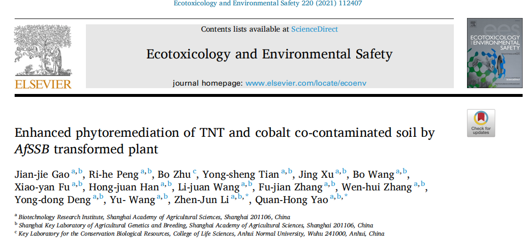 近期,我院生物技术研究所姚泉洪研究员和彭日荷研究员带领的农业合成生物学团队在植物修复混合污染物的研究取得进展。相关科研成果由高建杰博士主笔撰写两篇论文:“Phytoremediation of multiple persistent pollutants co-contaminated soil by HhSSB transformed plant(HhSSB转化植物修复多种持久性污染物混合污染土壤)”和“Enhanced phytoremediation of TNT and cobalt co-contaminated soil by AfSSB transformed plant(AfSSB转化植物强化修复TNT和钴混合污染土壤)”分别发表在期刊Environmental Research(IF 6.498)和Ecotoxicology and Environmental Safety(IF:6.291)。