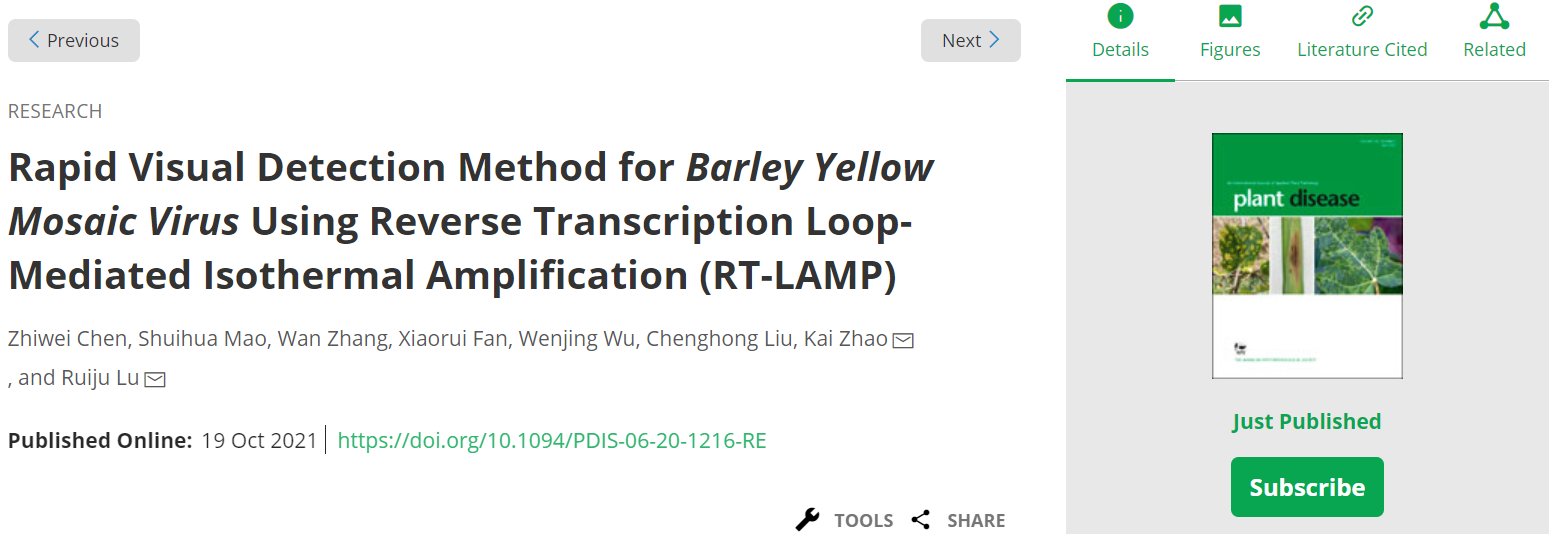 近日,由我院生物技术研究所陆瑞菊研究员、刘成洪研究员领衔的麦类作物高效育种技术创制及其应用科研创新团队在农林科学领域top期刊Plant Disease上发表了题为“Rapid visual detection method for barley yellow mosaic virus using reverse transcription loop-mediated isothermal amplification (RT-LAMP)”的研究论文。