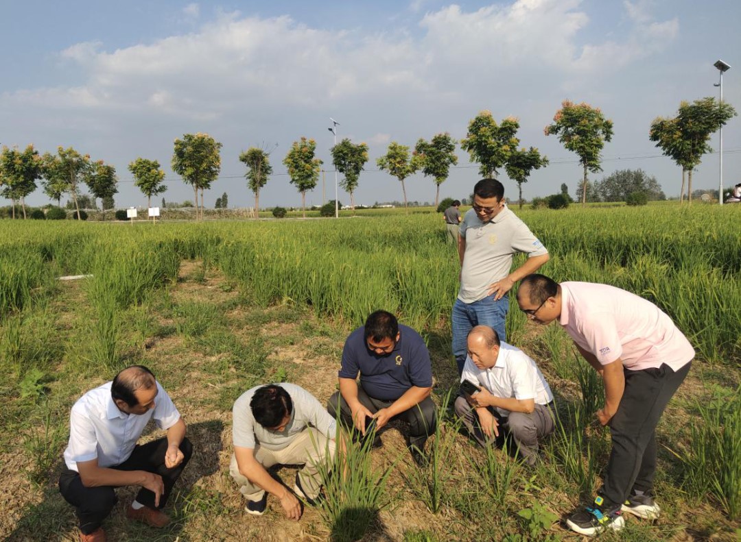 王家坝蓄洪区水淹后,罗利军(左二)一行考察节水抗旱稻生长情况