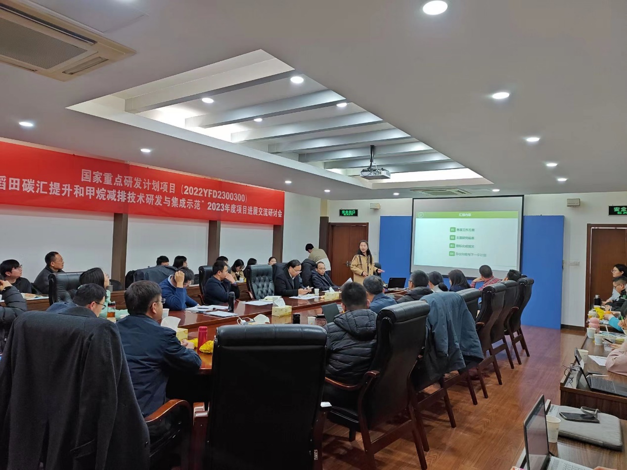 2024年1月19-20日,国家重点研发计划项目“稻田碳汇提升和甲烷减排技术研发与集成示范”项目进展交流研讨会在中国科学院南京土壤研究所召开。南京农业大学丁艳锋教授、中国科学院植物研究所研究员杨元合研究员、北京大学袁文平教授、湖南农业大学王华教授、中科院南京土壤研究所朱春梧研究员和夏龙龙研究员等专家组成员以及来自各研究单位的项目骨干共60余人出席年度总结会。我院科技人员周胜研究员、孙会峰副研究员和张鲜鲜博士参加了此次会议,张鲜鲜代表我院低碳团队进行了课题四子课题“水旱轮作区节水抗旱稻丰产低碳技术研发与评估”的2023年度工作总结汇报。