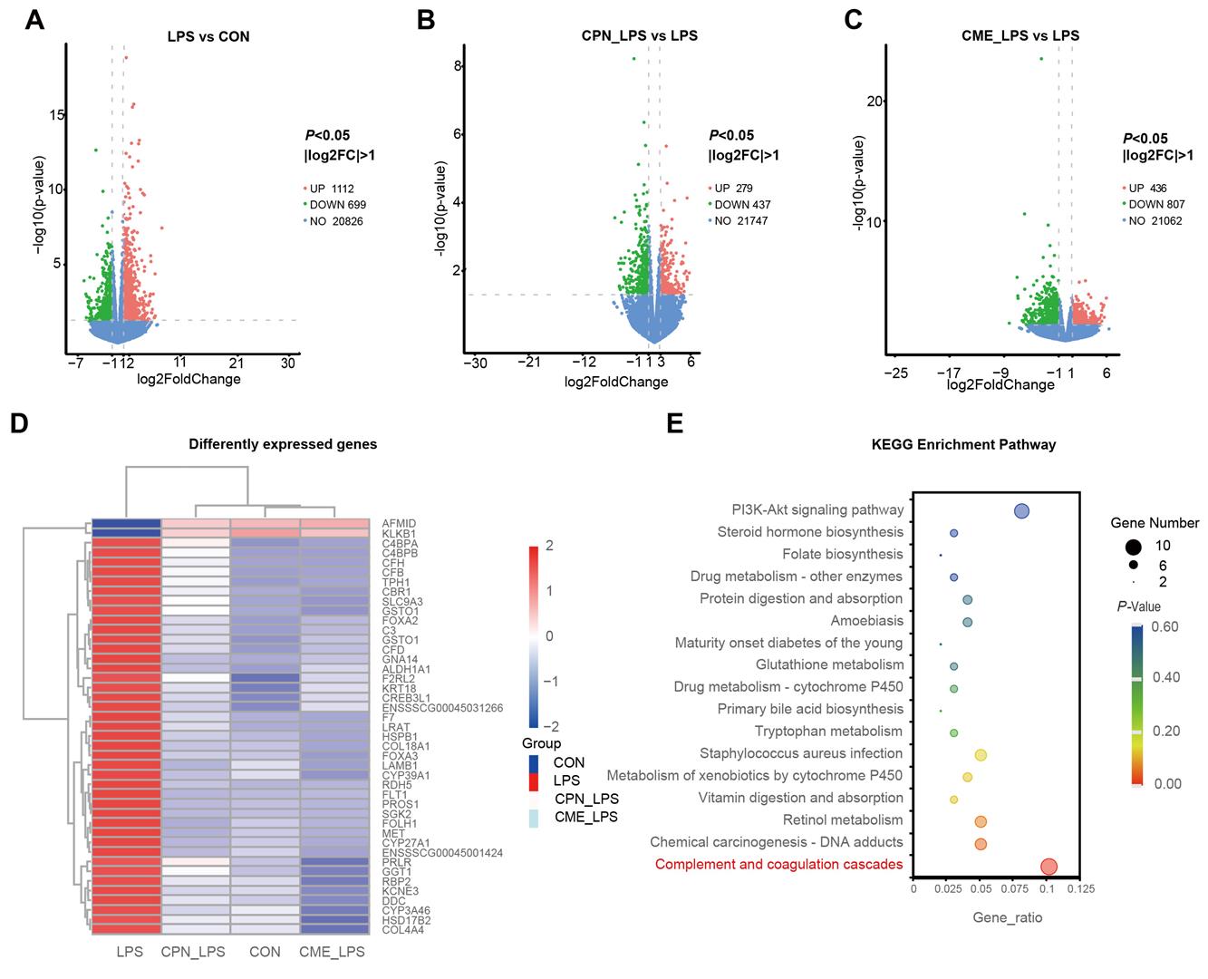 为此,研究团队首先利用苏木精和伊红染色法对LPS诱导的仔猪空肠和回肠切片进行染色观察。结果显示,添加虫草素和虫草提取物能够改善LPS诱导的肠绒毛脱落、增加绒隐比。之前研究表明,LPS能诱导仔猪肠道发生氧化应激,本研究发现饲料中添加虫草素和虫草提取物均能降低血清中MDA含量,发挥缓解仔猪氧化应激的作用。进而采用转录组学技术探究二者发挥抗氧化功能的潜在机制,结果表明,虫草提取物和虫草提取物通过调节补体和凝血级联反应缓解LPS诱导的仔猪肠道氧化应激与炎症反应。回肠内容物的16S rRNA结果表明,虫草素和虫草提取物补充能够改善肠道微生物组成,缓解LPS诱导的丁酸含量的降低。相关性分析也佐证了上述结果。这项研究表明,虫草提取物和虫草素能够缓解仔猪肠道炎症,为通过营养干预措施调控仔猪肠道健康提供了一种新方法。