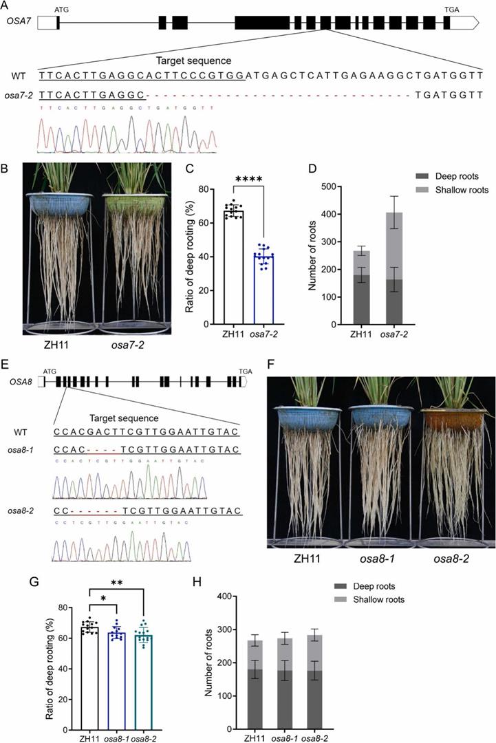 深根性是影响作物避旱性的重要性状之一。H+-ATP酶为细胞提供跨膜质子梯度,在植物生长和非生物胁迫反应中起着至关重要的作用。然而,它们在深根性中的功能还不清楚。在本研究中,研究人员分析了10 个水稻质膜H+-ATP 酶(OSA)的保守结构域、潜在磷酸化位点和三维结构。通过定量 PCR 分析,揭示了这些OSA基因在生长素等激素处理条件和干旱等非生物胁迫条件下的不同表达模式。亚细胞定位分析显示,大多数 OSA 蛋白定位于细胞膜。OSA 突变体的表型测定表明,osa7 和 osa8 突变体的深根比与野生型相比显著降低。此外,研究人员还分析了268份水稻种质资源中的OSA单倍型,并确定了与高深根比相关的单倍型。本文为进一步揭示质膜ATP酶在水稻响应干旱胁迫中的功能和应用于水稻抗旱性改良奠定了基础。