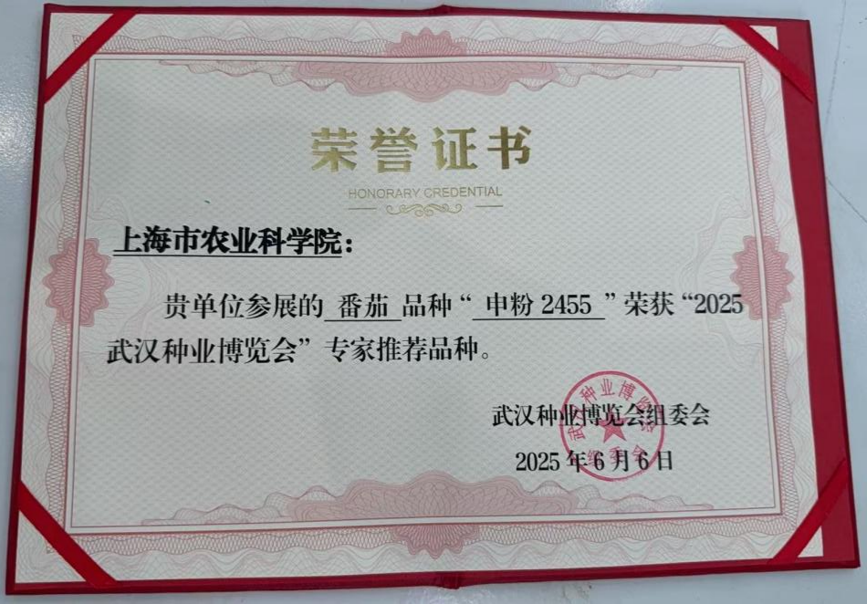 2025年6月7日,由我院园艺研究所番茄育种团队选育的口感型菜用番茄新品种“申粉2455”,凭借出色的综合性状在2025武汉种业博览会上获“专家推荐品种”荣誉称号。