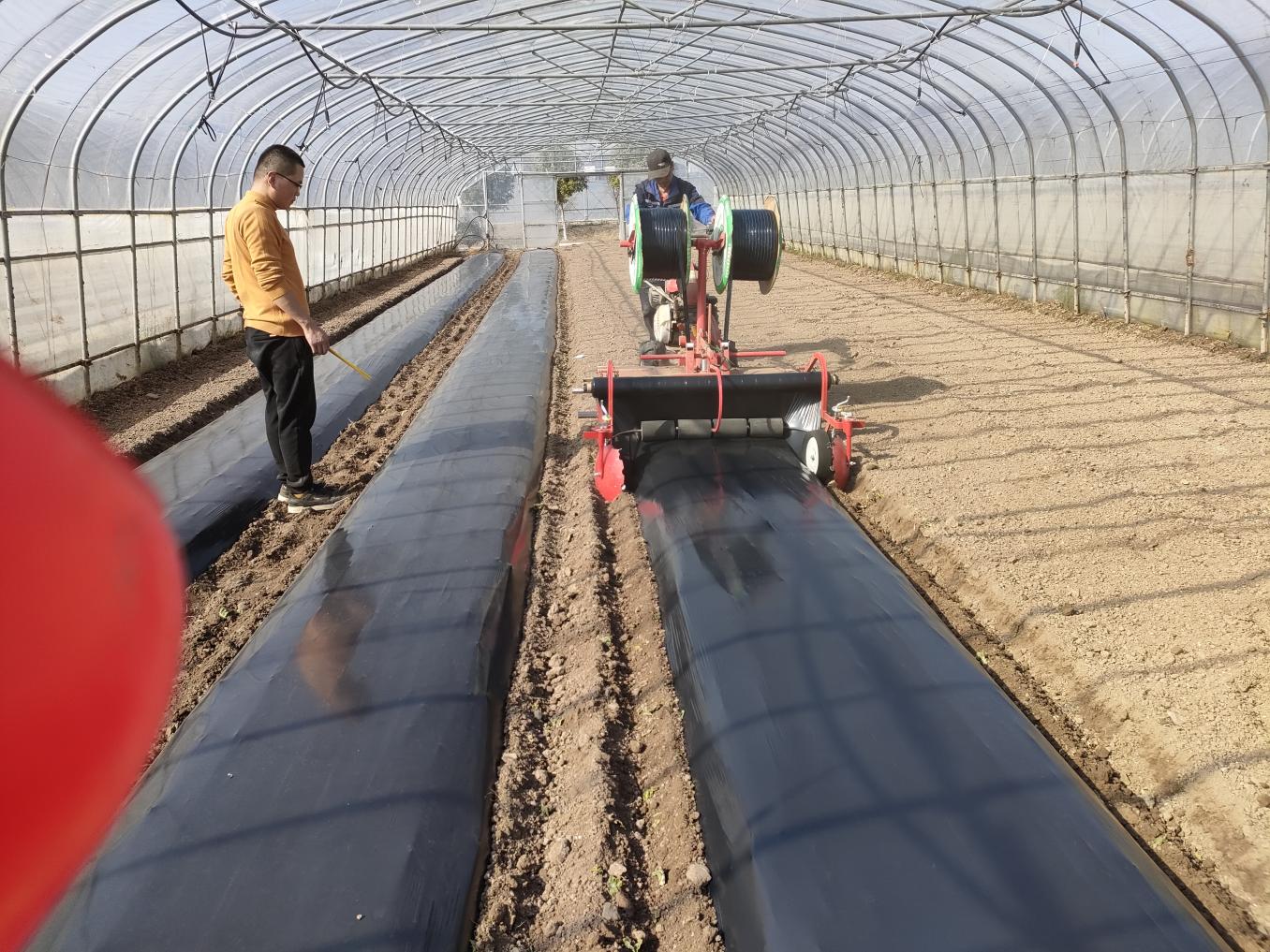 基地负责人张传玉介绍了基地茄果类蔬菜种植过程中存在的问题及对机械化生产的需求。张兆辉实地了解了该基地在茄果类蔬菜的种植情况,就机械化起垄+覆膜+铺管一体化及机械化移栽作业进行了现场指导,并对该基地的农机操作人员进行了培训,为下一步设施茄果类机械化生产技术的大面积应用提供了技术支撑。
