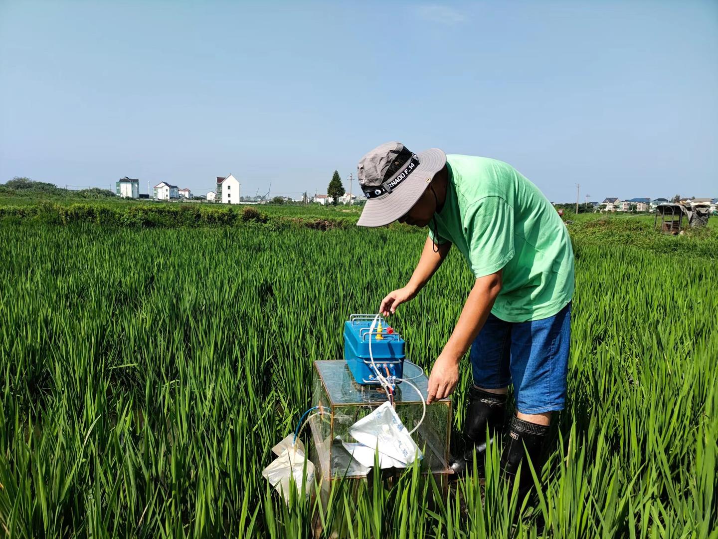 针对当地种植业特点,专家工作室以水稻种植和废弃物处理为低碳农业突破点,根据多年的低碳农业技术研究成果,制定了水稻种植区节水灌溉、秸秆循环利用、生态种养结合以及优化施肥措施等低碳种植路线,从而达到降低稻田温室气体排放强度,并提升农田土壤碳汇的目的;并将针对曹桥水稻生产、废弃物处理构建监测与低碳评价体系,最终形成从低碳生产技术实践到低碳效应评估的农业生产体系,实现曹桥低碳田园建设应用技术的集成与示范。为评估稻田温室气体减排与土壤碳汇效果,孙会峰副研究员与王从博士多次赴曹桥低碳田园示范区,进行稻田温室气体排放监测以及土壤采样,为“碳为观智·桨领风华”精品线建设提供观测数据,丰富了精品线的低碳科技内涵。