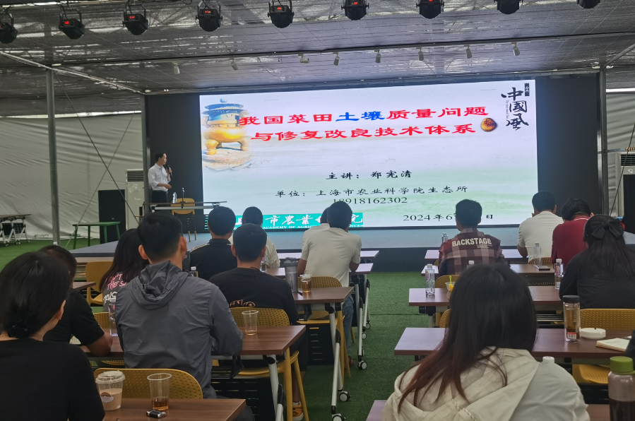 2024年6月27日,我院生态所郑宪清副研究员应邀为上海市松江区农业技术推广中心高素质农民培训班授课,上课地点设在上海市松江区张泽四村8号家绿彩虹农场会议室。来自上海市松江区张泽四村的蔬菜种植大户和合作社的主要技术骨干近40人参加培训。