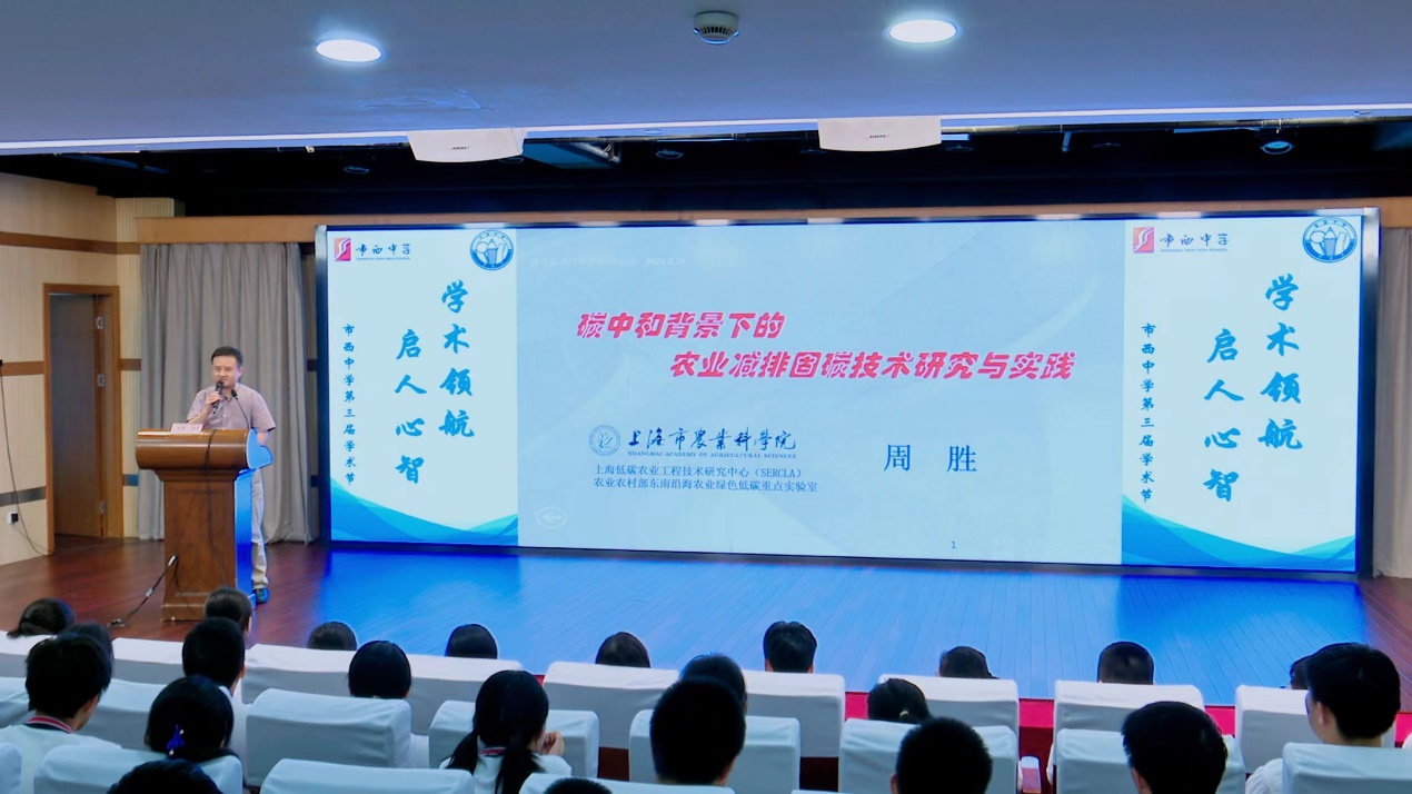 在市西中学力行楼8楼,能容纳三四百人的会议室坐满了该中学的老师和同学们。周胜研究员作题为“碳中和背景下的农业减排固碳技术研究与实践”的专题讲座。他从我国双碳战略提出的背景,目标及实现途径方面深入浅出地介绍了气候变暖的原因、农业领域实现碳中和目标的技术措施,着重阐述了实现种植业固碳减排的途径、减排方法学的认证以及碳交易等方面的内容。报告过程中,同学们反应热烈,积极进行现场互动,回答周胜研究员的问题,纷纷表示学到了书本上学不到的知识。