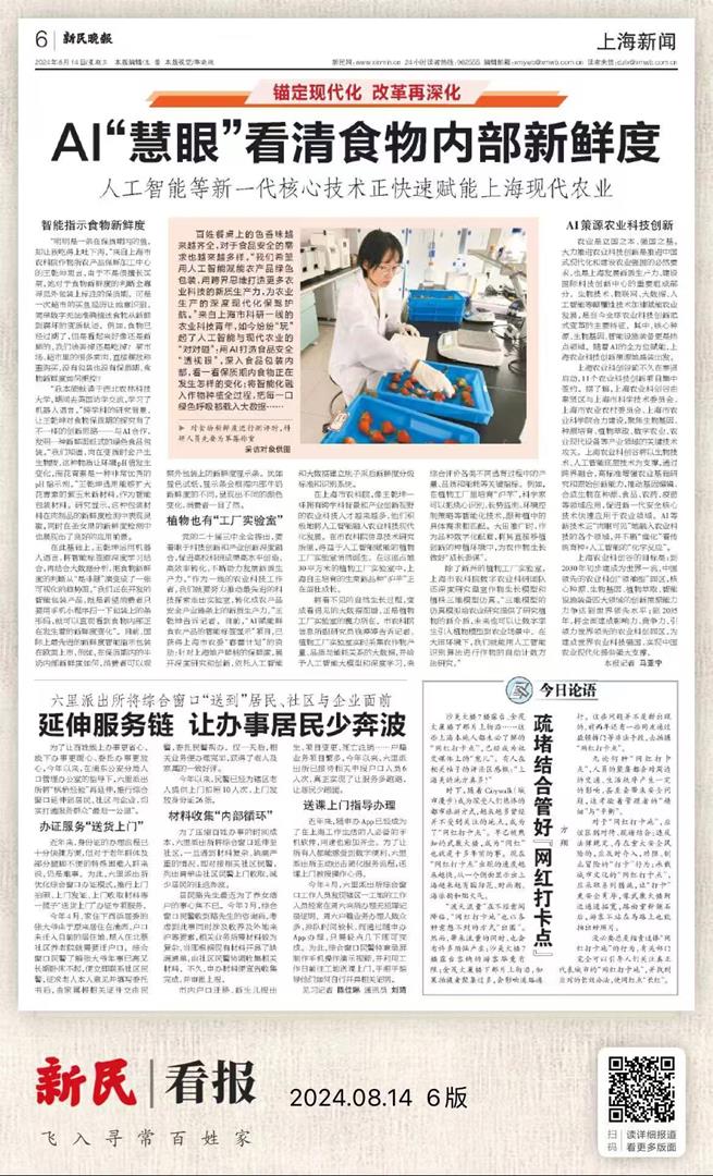 党的二十届三中全会提出,要着眼于科技创新和产业创新深度融合,促进高校科研成果高水平创造、高效率转化,不断助力发展新质生产力。“作为一线的农业科技工作者,我们就要努力推动最先进的科技探索走出实验室,转化成农产品安全产业链条上的新质生产力。”王乾坤告诉记者,目前,“AI赋能鲜食农产品的智能标签显示”项目,已获得上海市农委“春蕾计划”的资助:针对上海地产鲜桃的保鲜度,展开深度研究和创新,依托人工智能和大数据建立桃子采后新鲜度分级标准和识别系统。