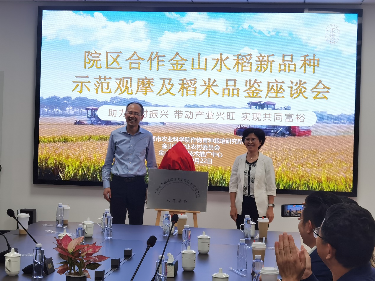在优质稻米产业发展座谈会上,翟欣和周昌艳代表双方为上海农产品保鲜加工技术研究中心示范基地(盛致公司)揭牌。姚春军和吴书俊就金山区水稻产业发展现状和院区合作在金山区布局水稻新品种试验与示范等情况做具体汇报。上海盛致农副产品有限公司、上海米大王米业集团有限公司等企业代表就上海地产优质米品牌建设和销售渠道拓展进行了交流。