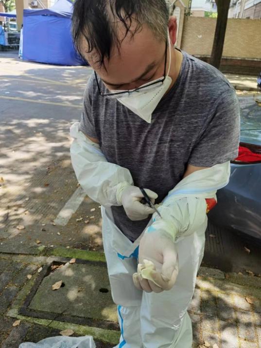 他是核酸检测志愿者。4月25日,小区出现阳性感染者,小区居民情绪有所波动,但核酸检测也需要每天进行。4月25日当天,他早上8点前就穿好大白防护服,但居委一直与上级部门沟通在什么范围内开展核酸检测,一直到十点多才确定小区全员核酸。当日核酸做完已经下午两点多,在高温下工作6个多小时,早已全身汗透。在五一假期的五天中,他每天都参与了核酸检测志愿者工作。