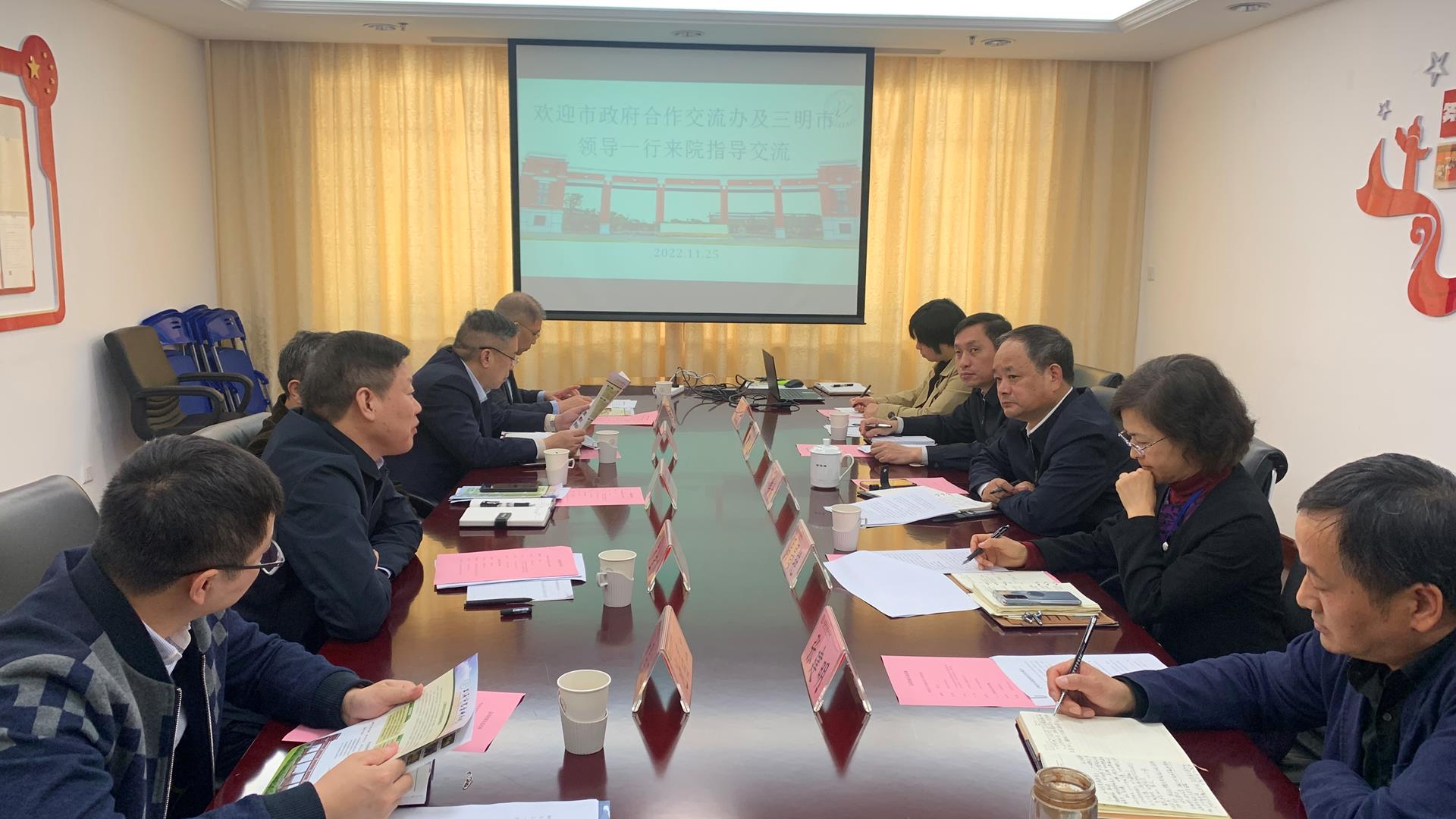 2022年11月25日,市政府合作交流办副主任强鹏程,三明市推进革命老区高质量发展示范区建设领导小组副组长、政协党组副书记、副主席罗金水等一行5人来院对接交流。院党委副书记徐伟林接待来宾一行。