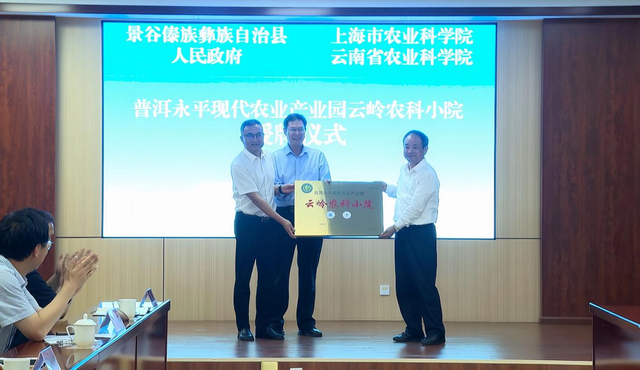 座谈会上,封峰感谢上海市农科院和云南省农科院一直以来对普洱的支持关心,期待与两院在更深层次、更广领域开展合作,共同探索农业科技合作的新模式、新路径。徐伟林在座谈会上介绍了我院学科设置等情况,表示沪滇合作历史悠久、情谊深厚,我院在景谷县永平镇蔬菜产业园的建设上,根据景谷县的气候、土壤等自然环境因素,按照景谷县蔬菜产业发展需求,一定给予全方位的支持与协助,并对蔬菜产业园的建设提出了针对性的建议。我院与云南省农科院分别向景谷县授予了沪滇科技协作蔬菜产业示范基地和普洱永平现代农业产业园云岭农科小院牌匾。